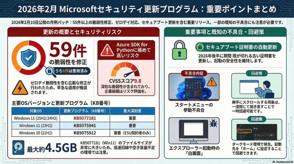2026年2月の月例パッチは、ゼロデイ脆弱性への対応とセキュアブート証明書の更新という重要な内容を含んでいます。一部不具合も報告されていますが、セキュリティリスクを考慮し、できるだけ早期の適用をおすすめします。