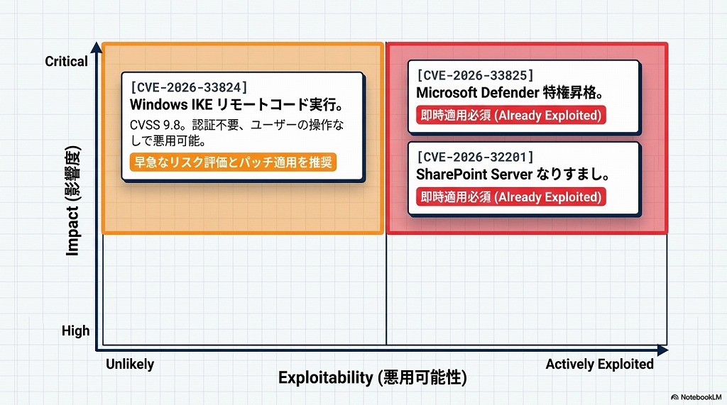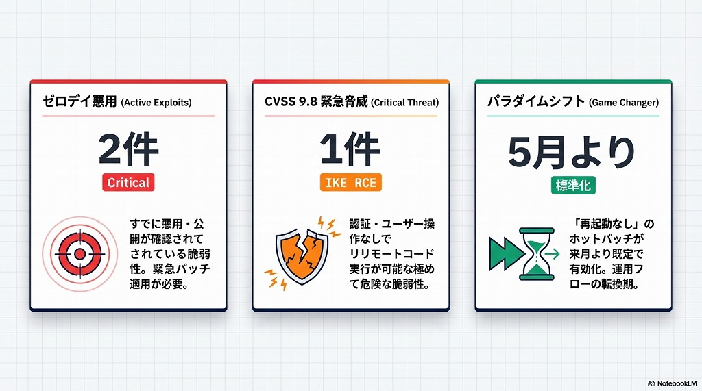 今月のアップデートは、すでにサイバー攻撃に悪用されていることが確認されている「ゼロデイ脆弱性」や、ユーザーの操作なしにネットワーク経由で攻撃が成立してしまう「CVSSスコア9.8」の極めて危険な脆弱性の修正が含まれており、すべての環境において迅速な適用が求められます。