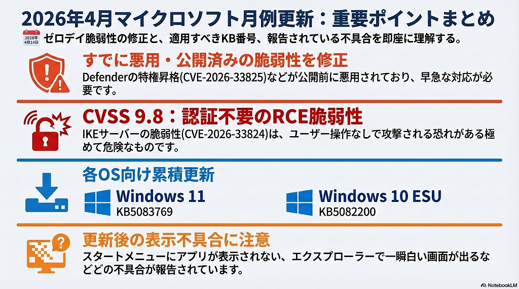2026年4月のWindows Updateは、悪用済みのゼロデイ脆弱性やCVSSスコア9.8の致命的な欠陥を修正する極めて重要な内容です。