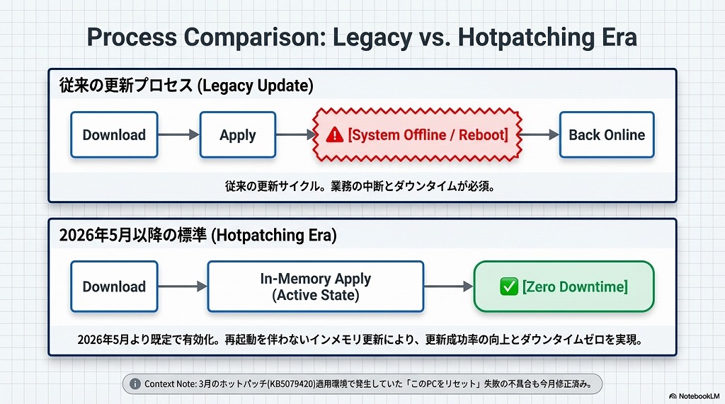 ① 2026年5月から「ホットパッチ(再起動なし)」が既定に