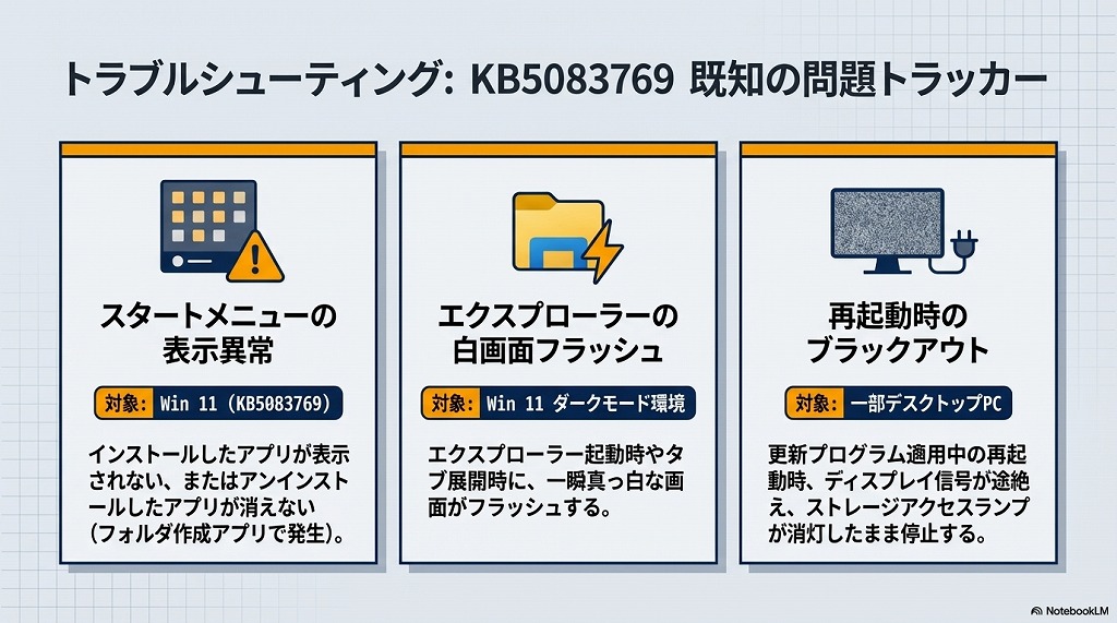 - 症状: 更新プログラム適用後の再起動中、ディスプレイの信号がなくなり、ストレージのアクセスランプも消灯したままフリーズしたように見えるケースが報告されています。