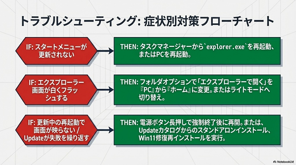- 回避策: エクスプローラーの「フォルダーオプション」を開き、「最初に開く画面」をデフォルトの「ホーム」に変更することで回避可能です。または、一時的にOSをライトモードに設定することでも解消されます。